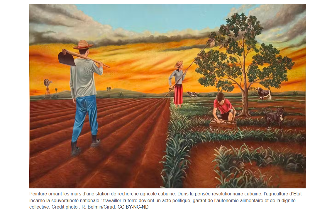 Peinture ornant les murs d’une station de recherche agricole cubaine. Dans la pensée révolutionnaire cubaine, l’agriculture d’État incarne la souveraineté nationale : travailler la terre devient un acte politique, garant de l’autonomie alimentaire et de la dignité collective.