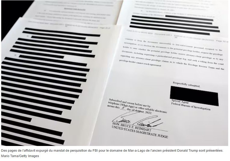 Des pages de l’affidavit expurgé du mandat de perquisition du FBI pour le domaine de Mar-a-Lago de l’ancien président Donald Trump sont présentées. Mario Tama/Getty Images