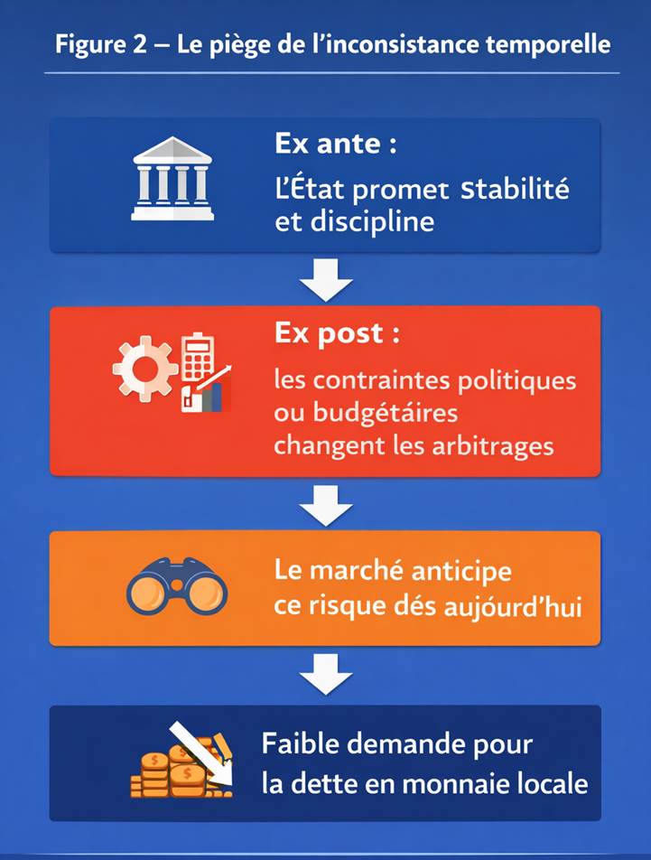 En clair, les investisseurs ne regardent pas uniquement le taux offert aujourd’hui. Ils évaluent surtout la probabilité que, demain, le cadre macroéconomique, budgétaire et monétaire reste assez stable pour préserver la valeur réelle de leur placement. C’est exactement ce que la théorie économique appelle le problème d’inconsistance temporelle.
