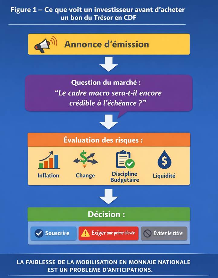 Lorsqu’un investisseur souscrit un bon du Trésor en CDF, il n’achète pas seulement un coupon. Il achète une promesse réelle de remboursement. Cette promesse dépend de plusieurs variables futures : l’inflation, le taux de change, la liquidité du marché, la trajectoire budgétaire et la coordination entre le Trésor et la Banque centrale. Si l’investisseur pense que l’État pourrait, demain, tolérer davantage d’inflation, relâcher la discipline budgétaire ou laisser se dégrader la valeur externe de la monnaie, le rendement nominal offert aujourd’hui devient moins attractif.
