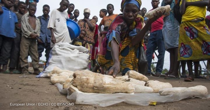 Les habitants du territoire de Kahemba en République démocratique du Congo, où beaucoup souffrent d'une mauvaise alimentation en raison d'un régime alimentaire composé en grande partie de manioc. Photo par : Union européenne / ECHO / CC BY-NC-ND